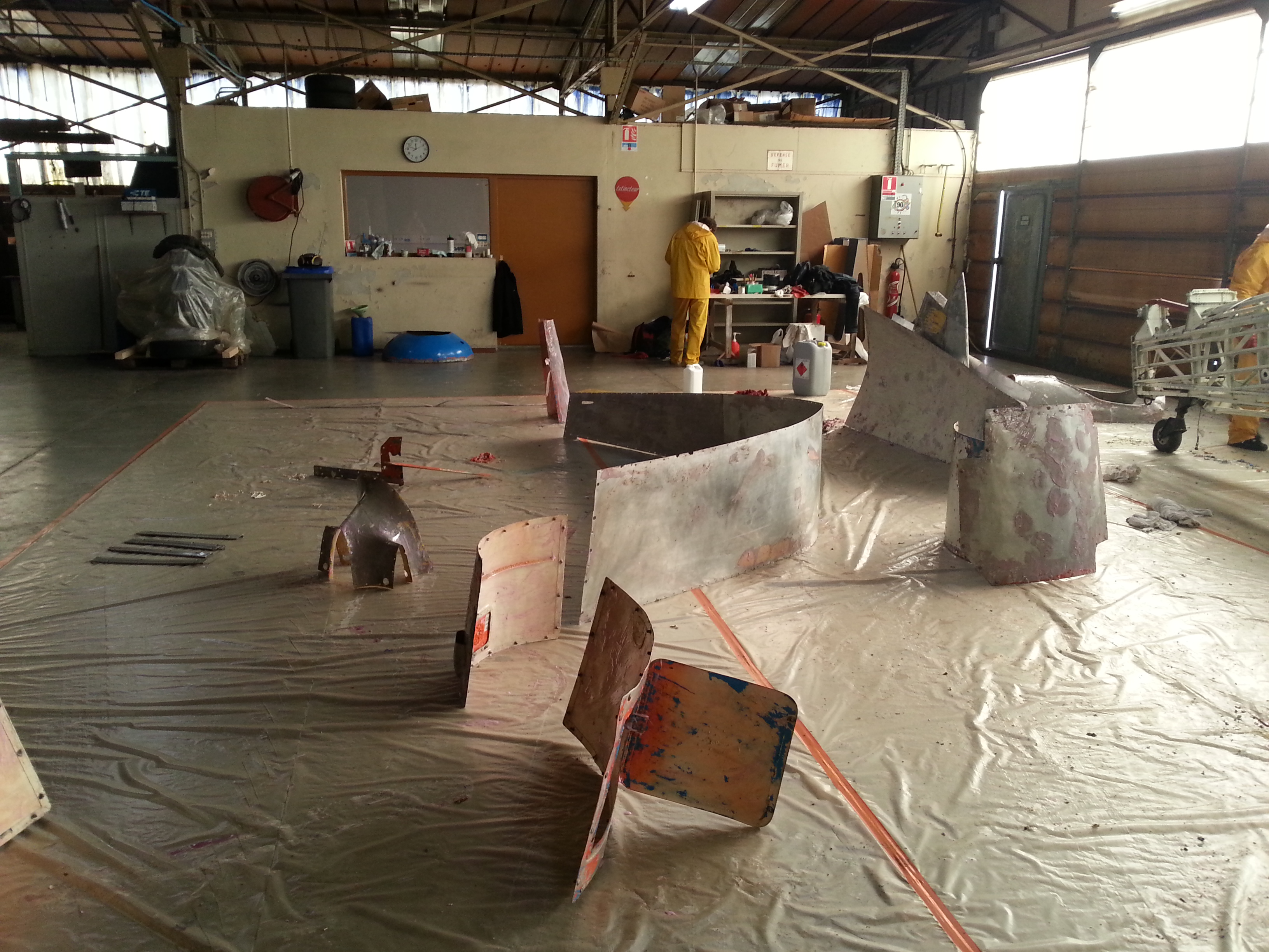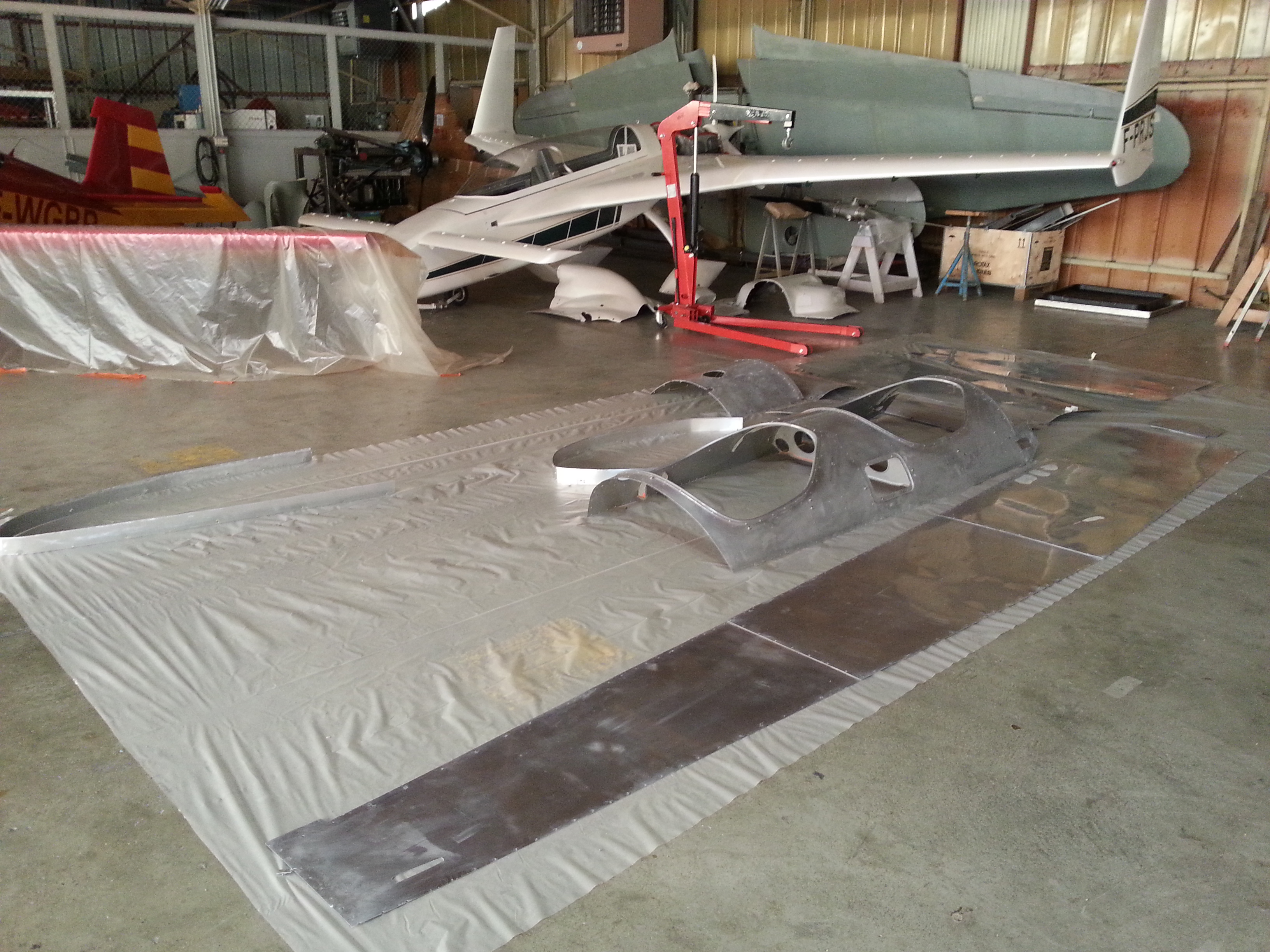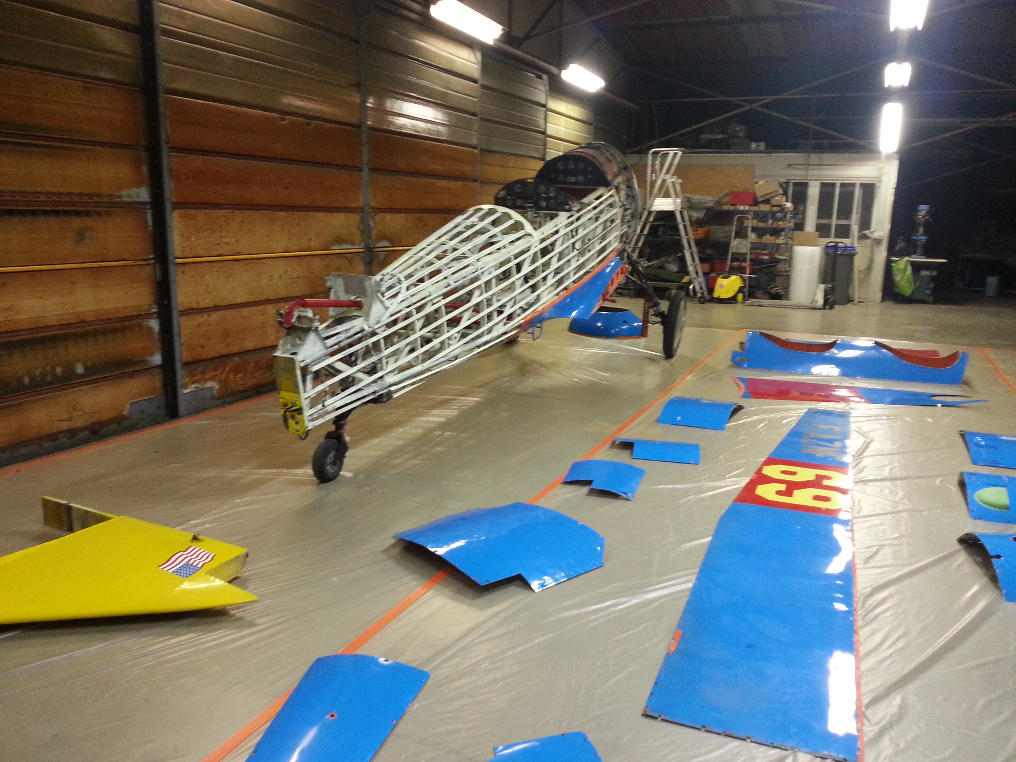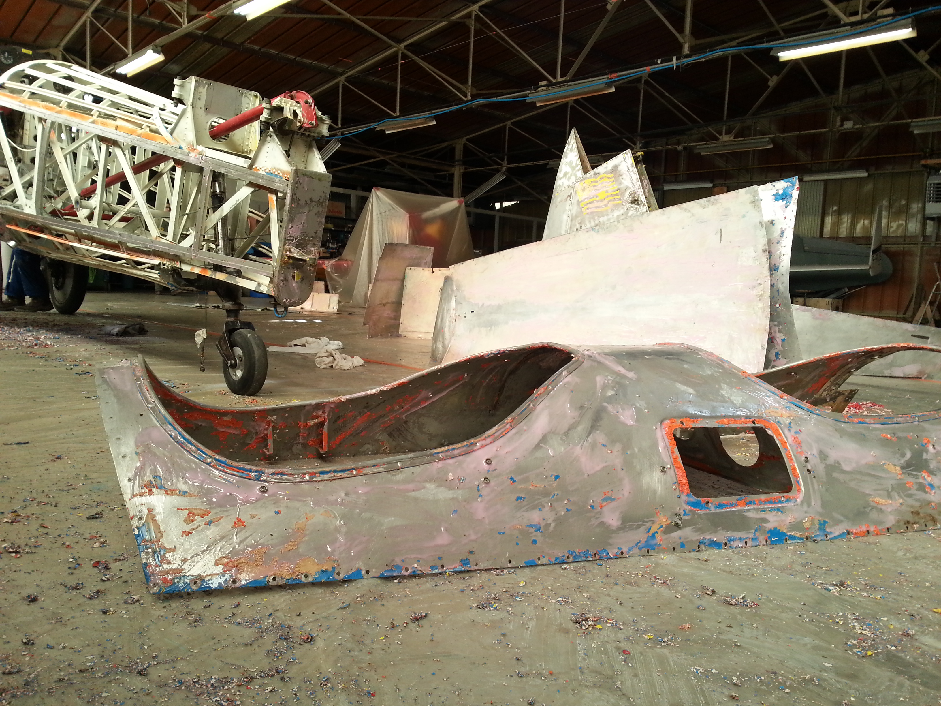 C’est donc à Dijon-Darois, chez Aéro Restauration Service (ARS) – atelier de maintenance qui s’est fait, sous la direction de Bruno Ducreux, une solide réputation dans le domaine des avions de collection – que nous avons convoyé dernièrement le N3N afin que ses ailes soient révisées et entièrement refaites après les dommages dus à la grêle. Durant cette période d’inactivité de l’avion, l’Amicale a décidé de donner un coup de beauté à cet ancien de l’US Navy et de lui modifier son « look ». Ainsi, une équipe de cinq membres de l’Amicale est partie passer un week-end en Bourgogne, chez ARS, afin de décaper l’intégralité des tôles du biplan. C’est dans la bonne humeur que cette opération s’est déroulée, l’occasion de partager des moments avec les copains de Dijon et de resserrer nos liens…